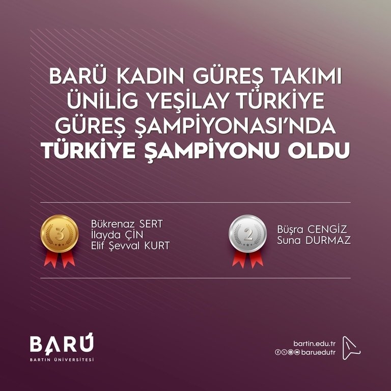 Kadınlar kategorisinde BARÜ’lü sporcular önemli dereceler elde etti. Bükrenaz SERT (76 kg), İlayda ÇİN (72 kg) ve Elif Şevval KURT (68 kg) rakiplerini geride bırakarak altın madalya kazandı. Büşra CENGİZ (59 kg) ve Suna DURMAZ (57 kg) ise gümüş madalya elde etti. Bu sonuçlarla BARÜ Kadın Güreş Takımı, topladığı puanlarla Türkiye Şampiyonu oldu.