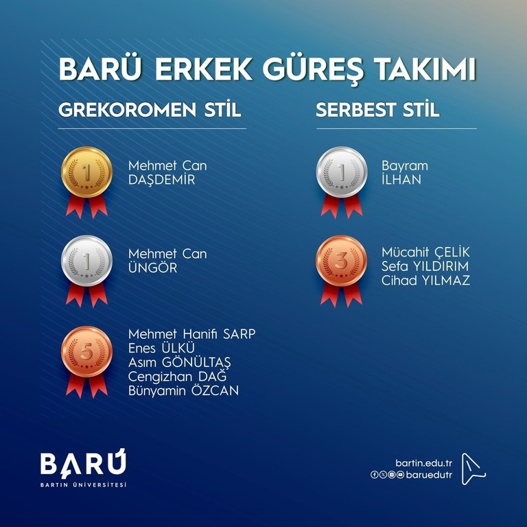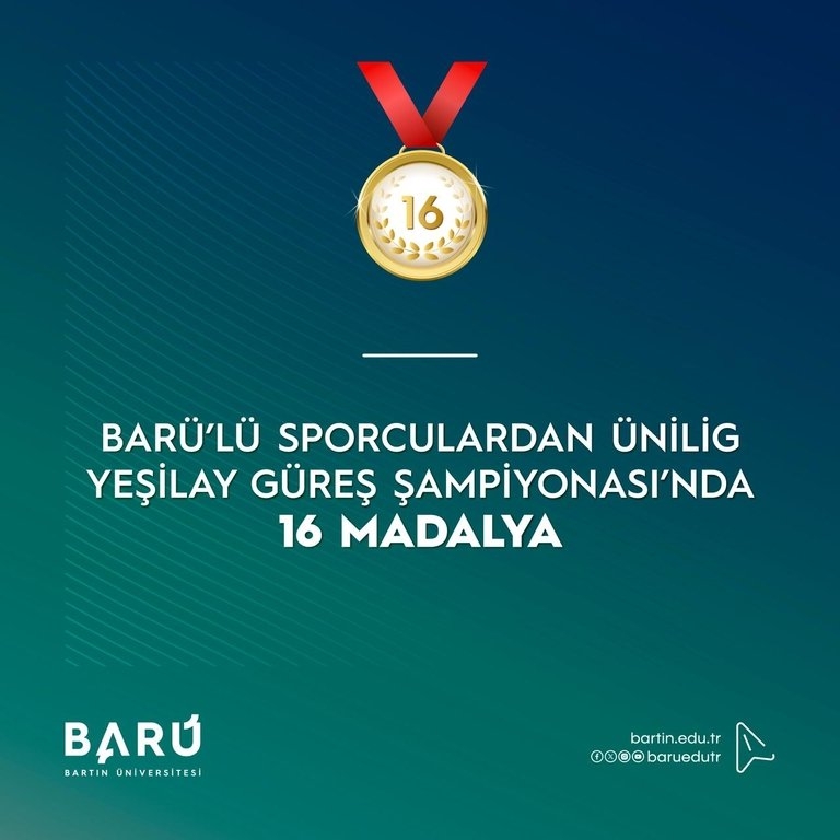 Bartın Üniversitesi (BARÜ), ÜNİLİG Yeşilay Türkiye Güreş Şampiyonası’nda elde ettiği derecelerle önemli bir başarıya imza attı. BARÜ’lü sporcular, organizasyonu 4 altın, 4 gümüş ve 8 bronz olmak üzere toplam 16 madalya ile tamamladı.